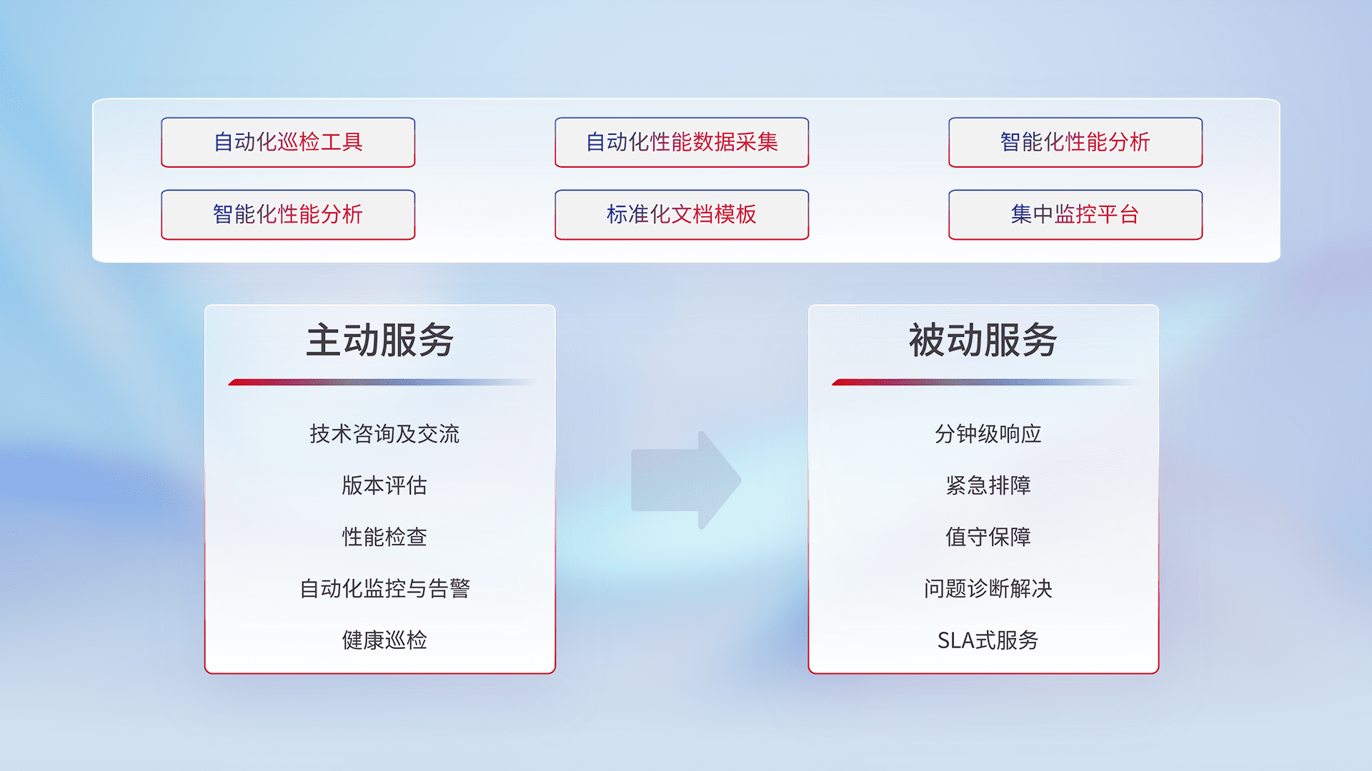 智能化工具和标准化文档,,,保障服务质量,,,,提供主动服务(包含技术咨询、、版本评估、、、、性能检查、、、、自动化监控与告警、、、健康巡检)和被动服务包含(分钟级响应、、、紧急排障、、值守保障、、、、问题诊断解决、、、、SLA服务)。。。。